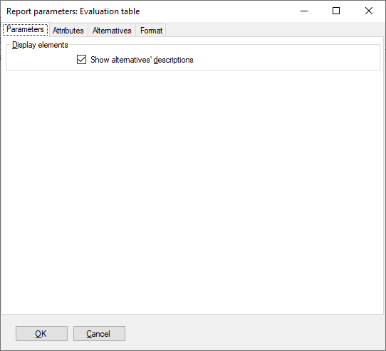 DEXiWin reports consist of zero or more report elements, each of which presents some viewpoint on the contents of the current DEXi model. Each element is associated with specific Report parameters, which define the element’s contents in more detail, for example, which attributes and/or alternatives to consider.